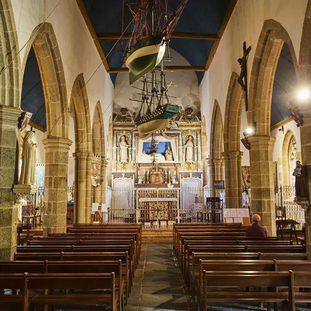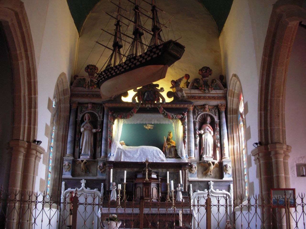 Здесь можно увидеть свисающие с потолка модели кораблей – в Бретани много моряков и рыбаков, и так они благодарили за спасение.