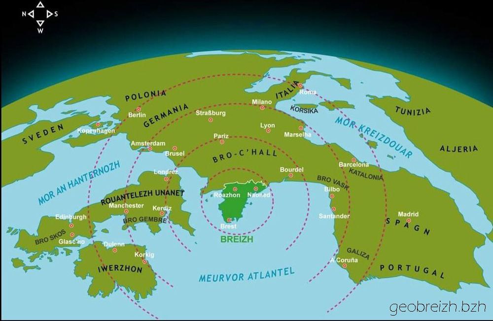 Например, западная часть Бретани по-бретонски называется Penn ar Bed, а по-французски Finistère (Финистер).